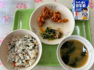 わかめごはん、牛乳、鶏肉のから揚げ、ごま酢和え、みそ汁でした。