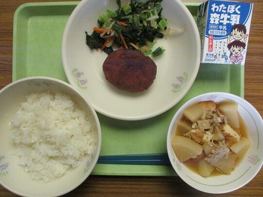 ごはん、牛乳、ゼリーフライ、おひたし、大根と豚肉の煮物でした。