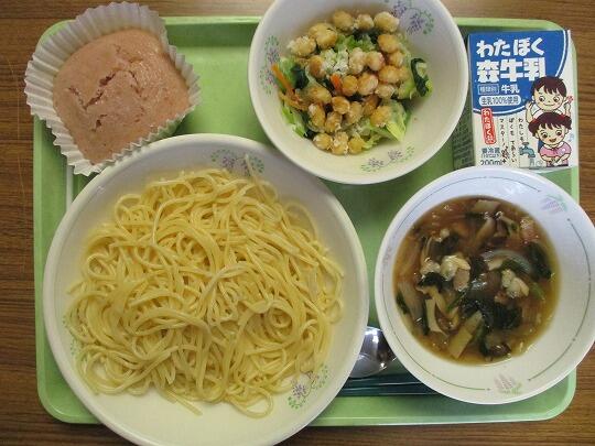いちご蒸しパン(春日部産いちごピューレ使用)、牛乳、スパゲッティ、和風ソース、揚げ大豆サラダでした。
