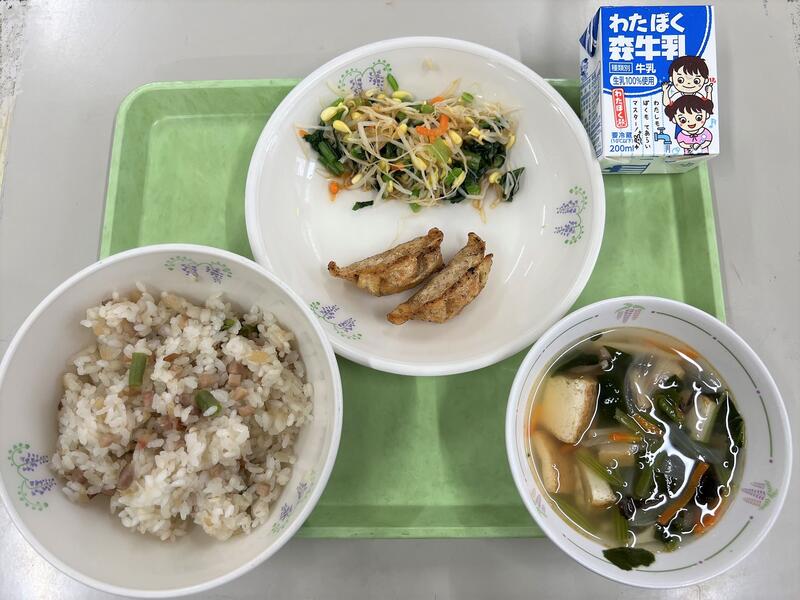 ごはん、牛乳、揚げ餃子、ナムル、中華スープでした。