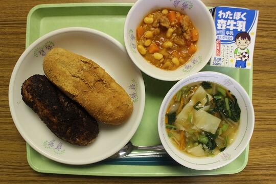 二色揚げパン、牛乳、ポークビーンズ、ワンタンスープでした。