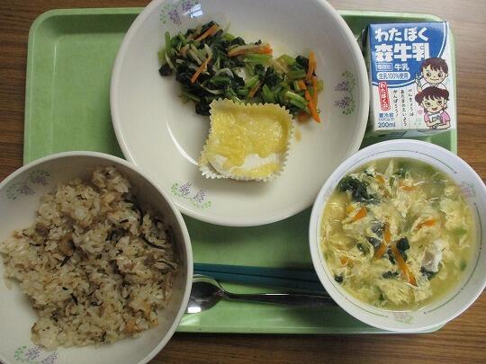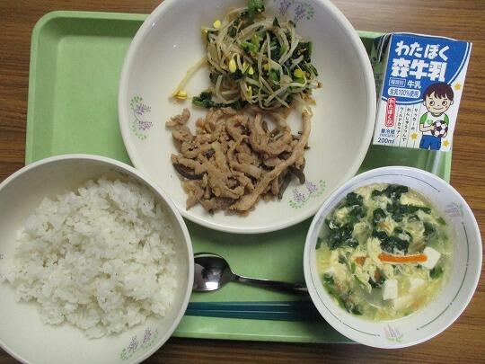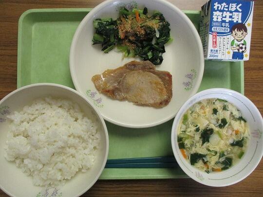 ごはん、牛乳、豚肉のみそ漬け焼き、ごま和え、かき玉汁でした。