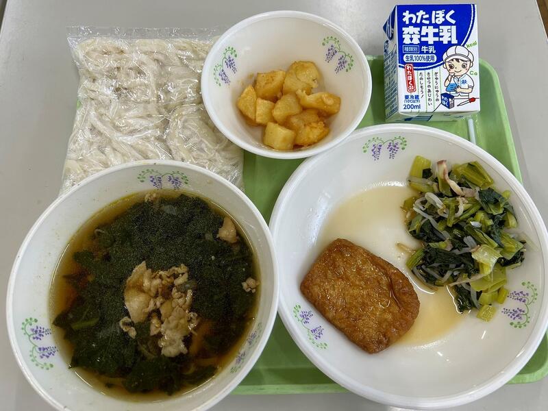 力うどん(地粉うどん、汁、きつね餅)、牛乳、小松菜のソテー、みそポテトでした。