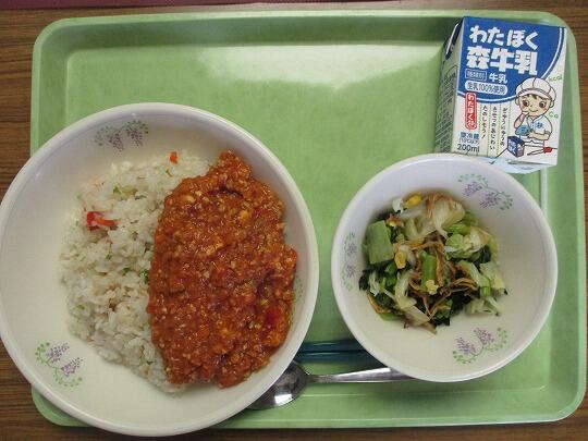 メキシコ風ピラフ(ごはん、ソース)、牛乳、青菜とじゃこのサラダでした。