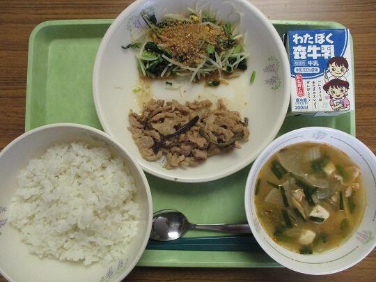 ぎはん、牛乳、豚肉の生姜焼き、みそ和え、磯煮でした。