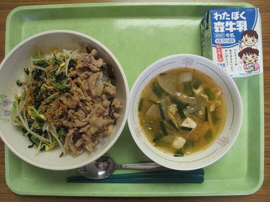ビビンバ(ごはん、具【肉】、具【野菜】)、牛乳、豆腐スープでした。