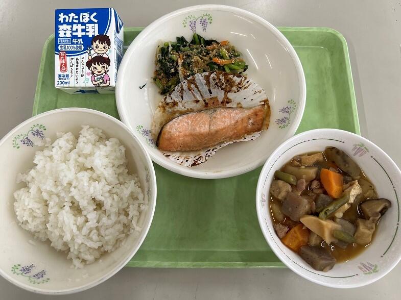 ごはん、牛乳、鮭の塩麴焼き、ごま和え、筑前煮でした。