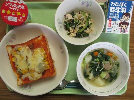 ピザトースト、牛乳、バンバンジーサラダ、じゃがいものコンソメスープ、ヨーグルトでした。