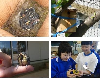 技術・家庭科のC.生物育成では栽培、飼育、水産などといった内容がありますが、栽培以外の内容は授業しにくい実態にあります。そこで、今年度も昨年度に引き続き、技術・家庭科の授業の一環で、木工室前の桜の木に巣箱を設置しました。見事「シジュウカラ」が住み着き、雛がかえりました。「ツーピーツーピー」とかわいい声で鳴いていました。生徒達は雛を観察し、3週間ほどで成長、飛び立つ姿に感激しました。そして昨日巣立っていきました。来年度も住み着いてくれることを祈っています。