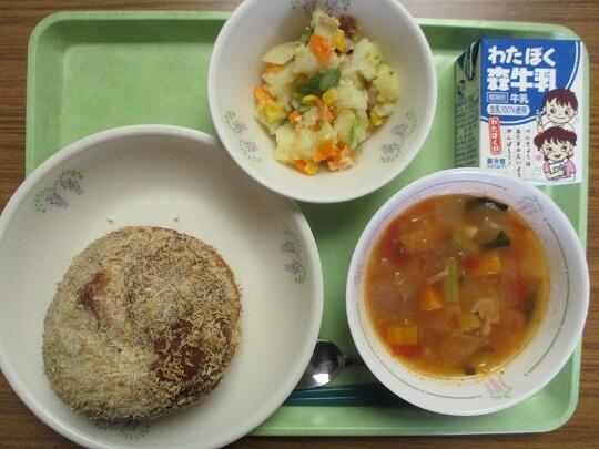 焼きカレーパン、牛乳、アスパラ入りミックスポテト、春キャベツと魚介のミネストローネでした。
