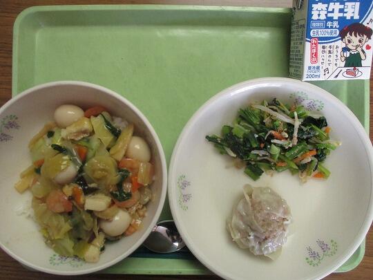 今日の給食(3月4日月曜日) 投稿日時 : 2024/03/04 大沼中学校管理者 カテゴリ: 今日の給食のメニューは 中華丼(ごはん、あん)、牛乳、手作りしゅうまい、ナムルでした。 今日も美味しい給食をありがとうございました。