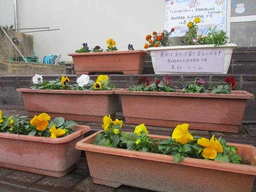 職員玄関前の階段です。用務員さんがパンジーを植えてくれました。