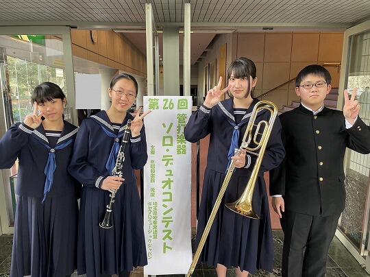 ソロ・デュオコンテスト 投稿日時 : 2023/02/23 大沼中学校管理者 カテゴリ: 本日、久喜総合文化会館で第26回管打楽器ソロ・デュオコンテストが行われました。 本校からウインドオーケストラ部員と有志の系4名が参加し、日頃の練習の成果を披露しました。