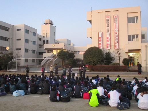 1年生スキー教室 投稿日時 : 2020/01/16 大沼中学校管理者 カテゴリ: 1月16日木曜日、今日から1年生はスキー教室です。朝6時20分頃の校庭はまだ太陽が昇り始めたばかりで薄暗い様子でしたが、出発式が始まる頃には周囲も明るくなってきました。皆さんが無事に帰ってくるのを待っています。