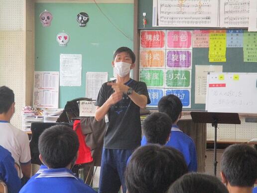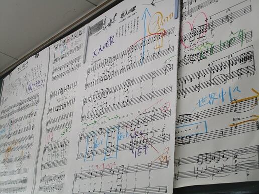 3年生音楽です。「若人の歌」について、先生のアドバイスを受けています。