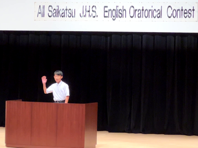 本日、蓮田市総合文化会館ハストピアにて、「All Saikatsu Junior High School English Oratorical Contest」(埼葛中学校英語スピーチコンテスト)が行われました。市内を勝ち抜いた2年生が出場しました。堂々と気持ちがこもった素晴らしいスピーチでした。見事7位入賞で、28日に行われる県大会に出場が決まりました。おめでとうございます。