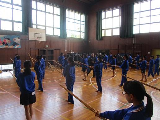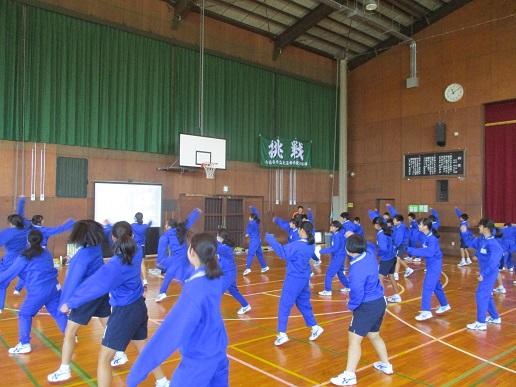1年生保健体育です。体育館でダンス・柔道・剣道に分かれて取り組んでいます。