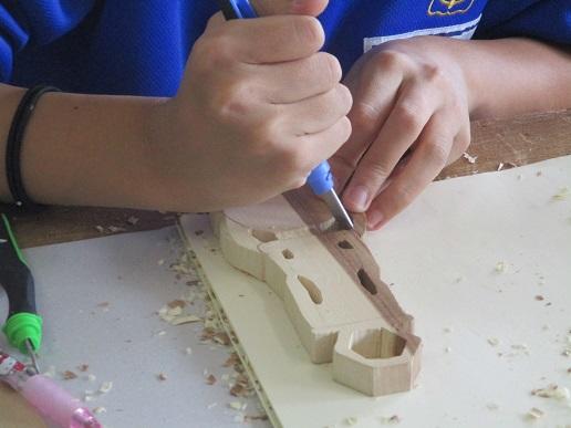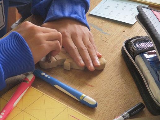 1年生美術です。彫刻刀で木を削り、「私のスプーン」を制作しています。