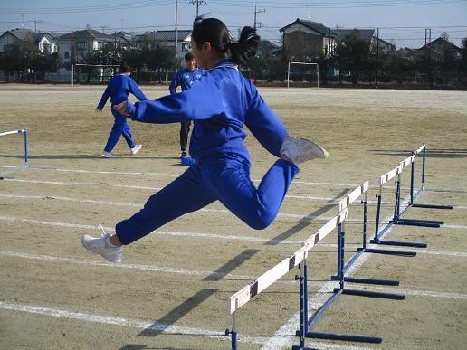 3年生保健体育です。女子が校庭でハードル、男子がバスケットボールコートで走り高跳びを行っています。