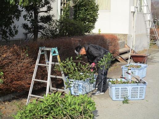 用務員さんが懸垂幕前にあるキンモクセイの剪定をしてくれています。いつもありがとうございます。