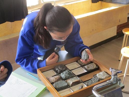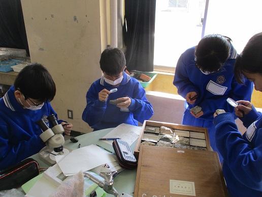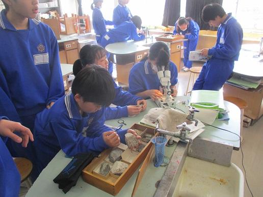 1年生理科です。安山岩、花崗岩などを顕微鏡で観察しています。