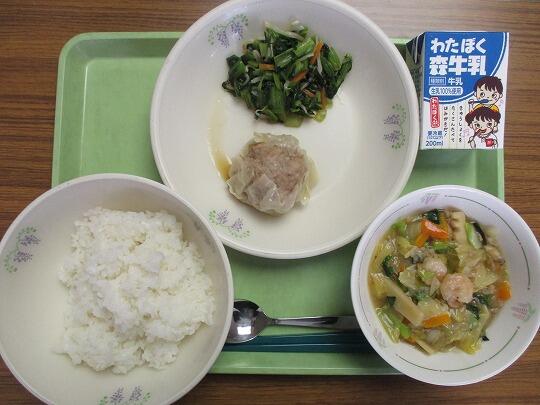 中華丼(ごはん、あん)、牛乳、手作りしゅうまい、華風和えでした。