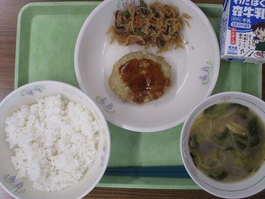 ごはん、牛乳、れんこんハンバーグ、切り干し大根の煮物、ごまみそ汁でした。