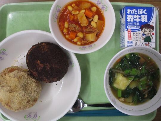 二色揚げパン、牛乳、ポークビーンズ、ワンタンスープでした。