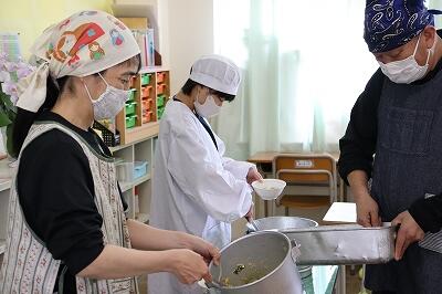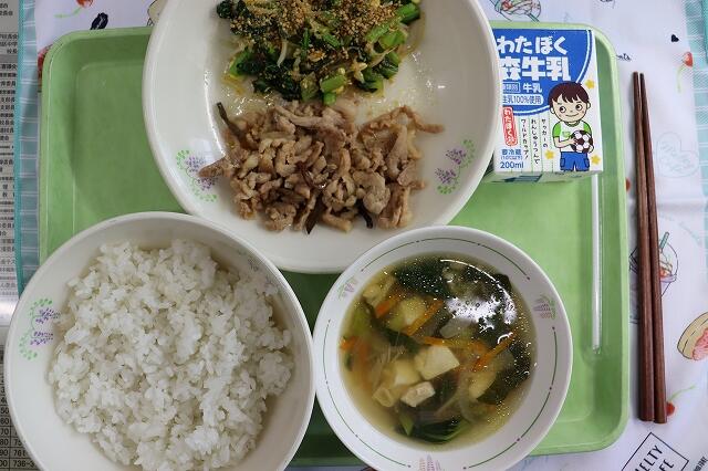 6月25日(水)ごはん、牛乳、わかめとじゃこの佃煮、ポテトのマリアナソース和え、チンゲン菜のスープ