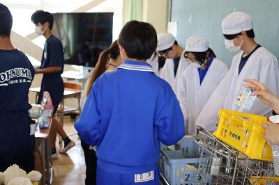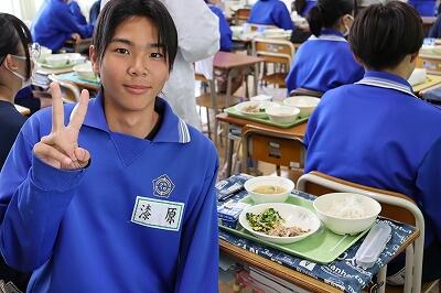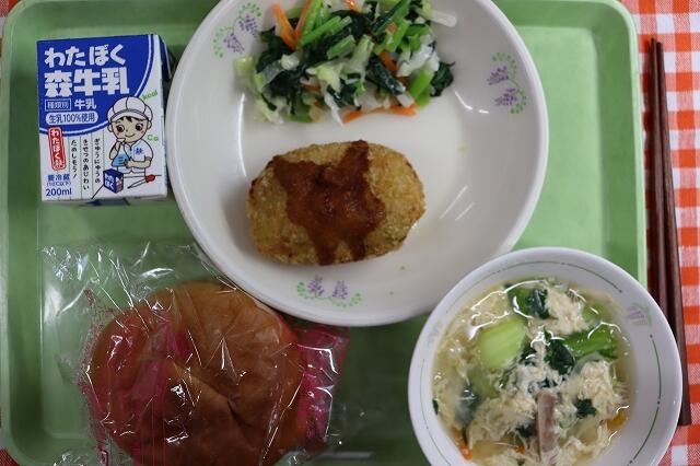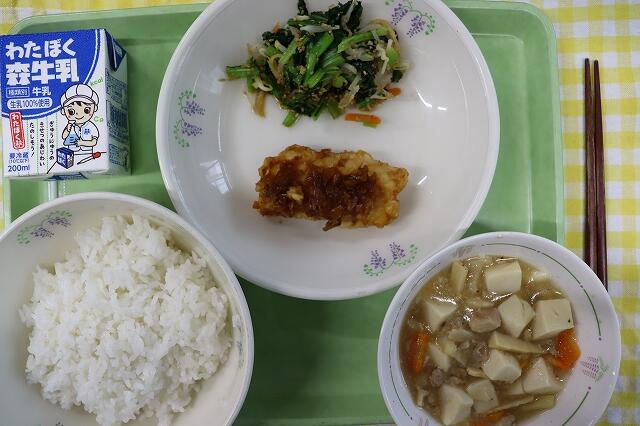 6月16日(月)ごはん、牛乳、ゼリーフライ(行田市の郷土料理)、青菜ともやしの和え物、凍り豆腐の煮物