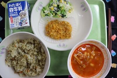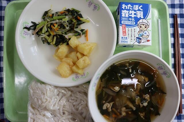 6月23日(月)わかめごはん、牛乳、鶏肉の唐揚げ、ごま酢和え、みそ汁