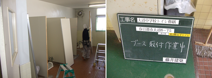 老朽化したトイレブースの付け替え工事を行っています。今年度、取り替え工事の対象は、教室棟4階西女子トイレ、2階東女子トイレ、2階東男子トイレ、1階東男子トイレの4カ所です。8月31日に完成予定です。