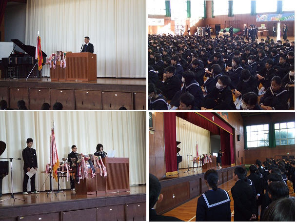 体育館への集合状況もよく、予定どおり始業式が始まりました。各学年の代表生徒(1年杉本君、2年鳴海さん、3年飯口君)の「新年の抱負」、校長式辞、校歌斉唱と、ほどよい緊張感をもって進行し、3学期への意気込みが表れたよい始業式となりました。