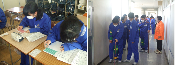 本日、5・6時間目に1学年で福祉体験学習が行われました。生徒達は、車いす体験、点字体験、手話体験、視覚障害体験、高齢者疑似体験の中から2つのコースを選択し体験を行いました。