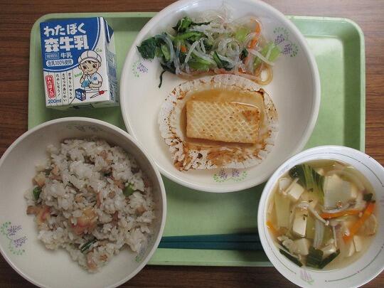 こぎつねごはん、牛乳、鮭のマヨネーズ焼き、切り干し大根の和え物、みそけんちん汁でした。