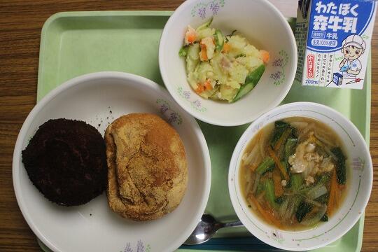 こどもパン、牛乳、そら豆入りコロッケ、パリパリサラダ、レンフォアタンでした。