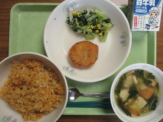 わかめごはん、牛乳、鶏肉の唐揚げ、ごま酢和え、みそ汁でした。