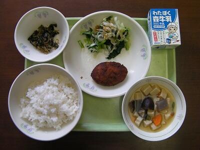 ごはん、牛乳、和風ハンバーグ、みそ和え、のっぺい汁でした。