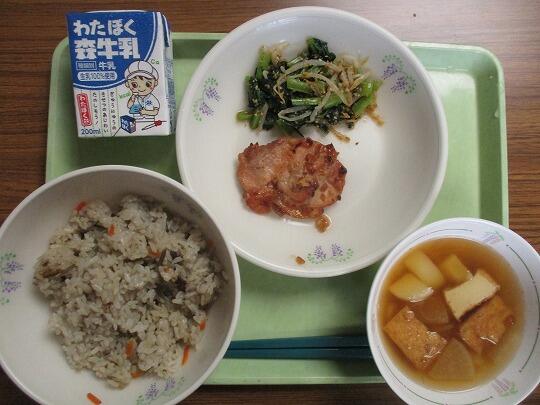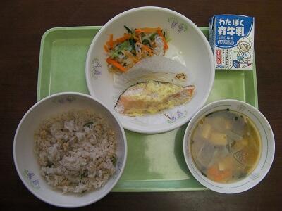 こぎつねごはん、牛乳、鮭のマヨネーズ焼き、切り干し大根の和え物、みそけんちん汁でした。