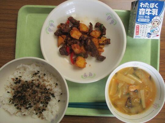 ごはん、手作りふりかけ、牛乳、ポテトのマリアナソース和え、キムチスープでした。