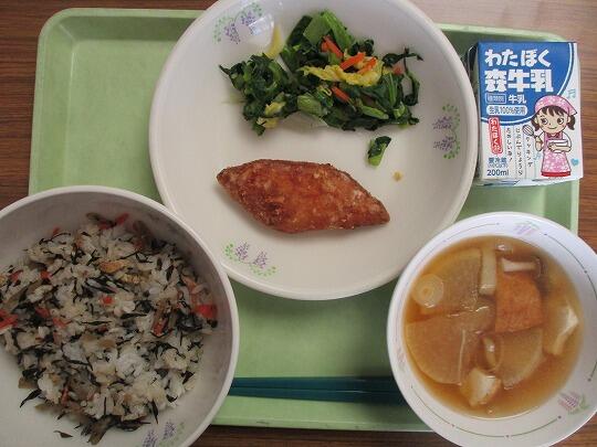 ひじきごはん、牛乳、ソフトカレイの竜田揚げ、アーモンド和え、田舎汁でした。