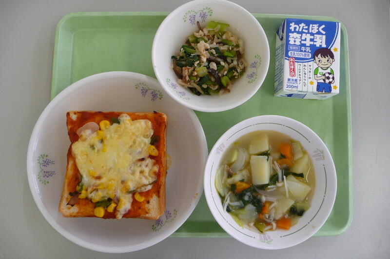 ピザトースト、牛乳、バンバンジーサラダ、じゃが芋のコンソメスープ煮でした。