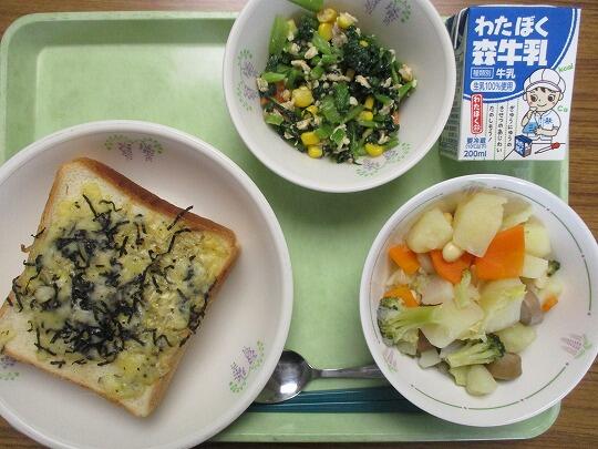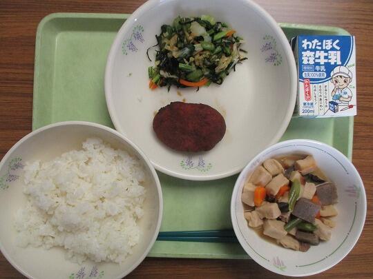 ごはん、牛乳、ゼリーフライ、磯香和え、凍り豆腐の煮物でした。