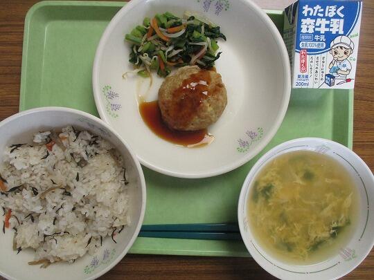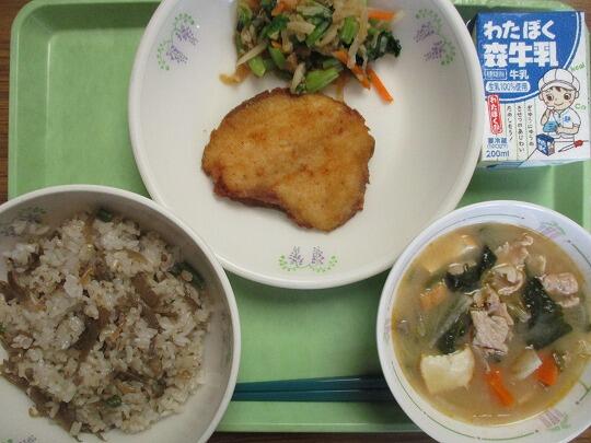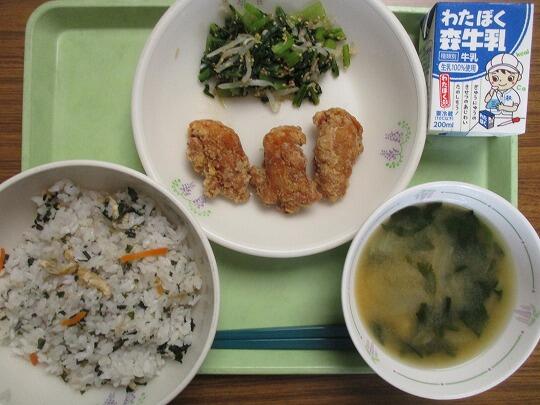きんぴらごはん、牛乳、ソフトカレイの竜田揚げ、切り干し大根の和え物、ピリ辛みそ汁でした。