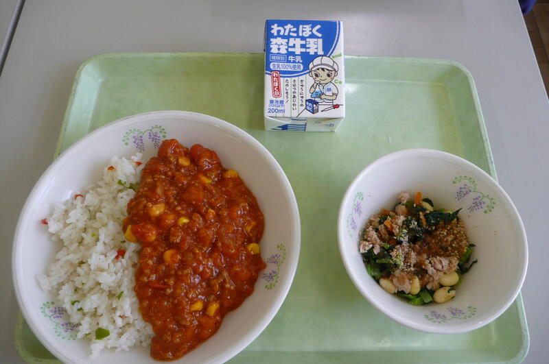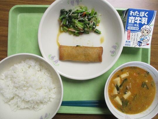 ごはん、牛乳、県産しゃくし菜春巻き、華風和え、マーボー豆腐でした。