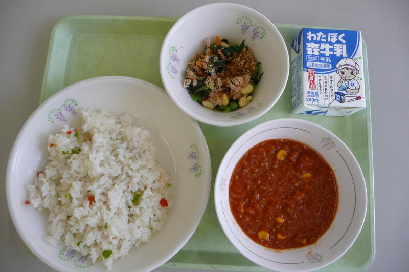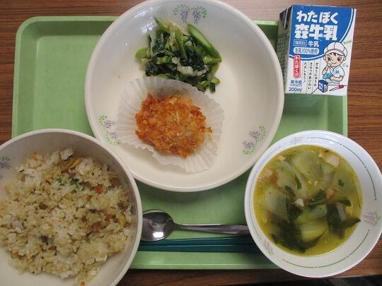 シーフードカレーピラフ、牛乳、チキンのこんがり焼き、アスパラサラダ、コンソメスープでした。