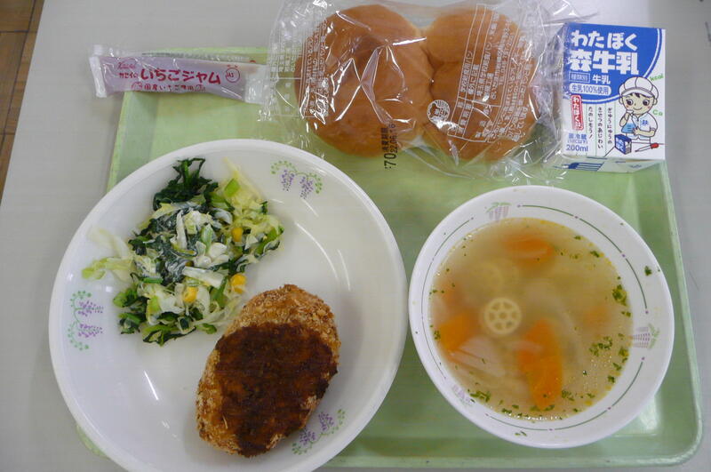 子どもパン、牛乳、そら豆入りコロッケ、コールスローサラダ、マカロニスープ、いちごジャムでした。