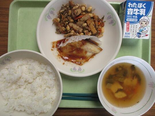 ごはん、牛乳、さばのヤンニョムカンジャンがけ、昆布の炒り煮、チンゲン菜のスープでした。