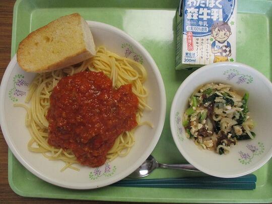 シュガーフランス、牛乳、スパゲッティ、ミートソース、バンバンジーサラダでした。