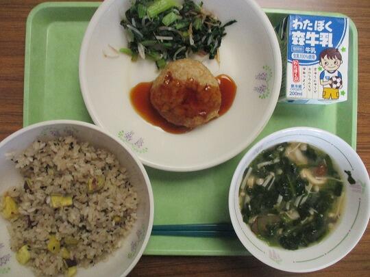 さつま芋ごはん、牛乳、和風ハンバーグ、あひたし、きのこのみそ汁でした。